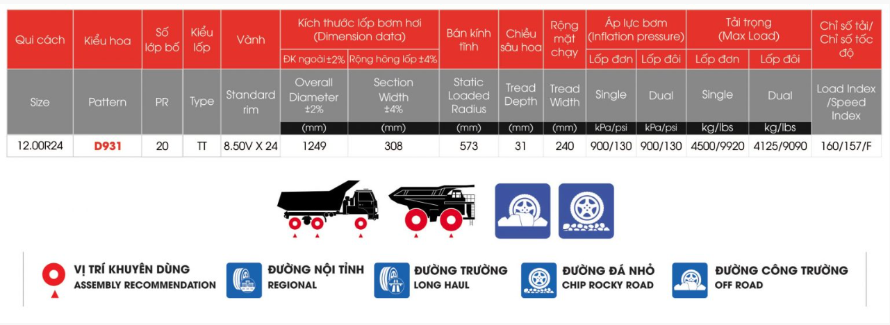 Шина 12.00R24 DRC D931 — радиальная внедорожная грузовая спецшина вьетнамского производства для карьерных самосвалов с тяговым протектором E-3 глубиной 31 мм.