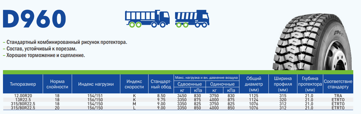 Углубленный протектор шины LINGLONG D960 показывает прекрасные тяговые характеристики, длительный срок службы (с минимальной потерей характеристик). Каркас из цельного металла придает шинам прочность к повреждениям (удары, проколы, царапины).